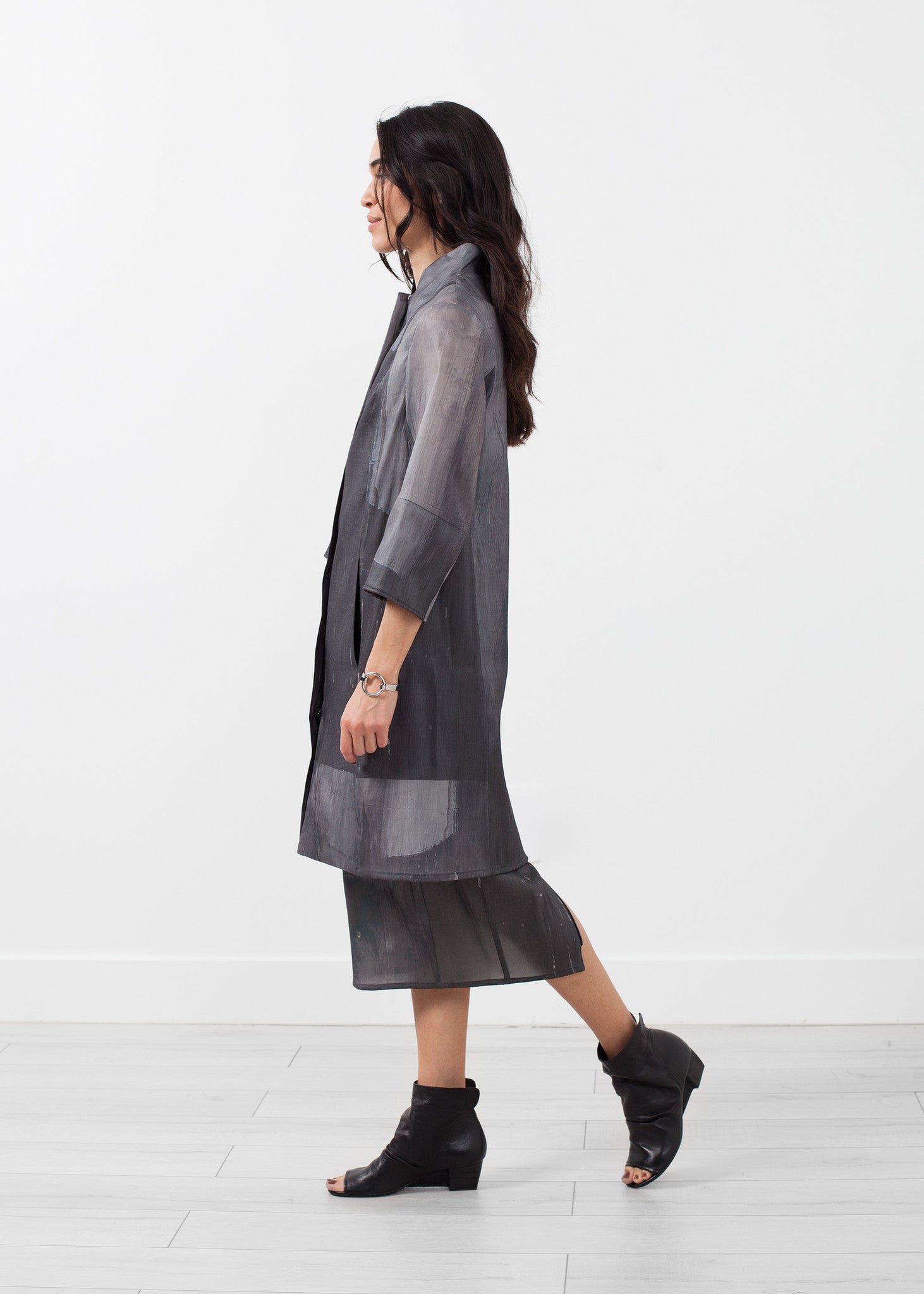 The Dixis Coat is a fantastic spring piece with its abstract print and sturdy, yet lightweight, material. 3/4 inch sleeves. Mandarin collar. Full, covered zip closure at front. Side angled pockets at front. Annette Gortz. Color Check. 64% Polyamide, 39% Cotton, 7% Spandex, Trimming 70% Linen, 27% Viscose, 3% Spandex. Made in the EU. Ashley is wearing a Small.
