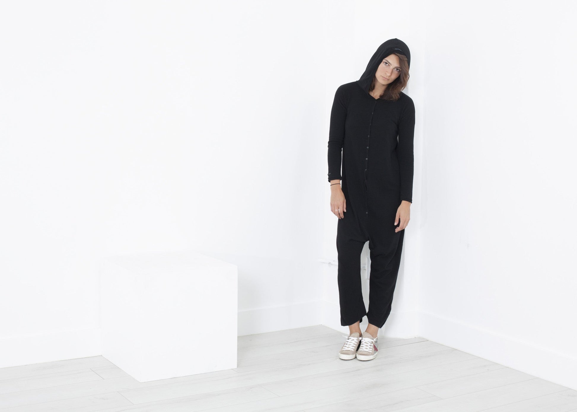 This hooded jumpsuit from Album di Famiglia has baby snaps down the center front and a low slung inseam making ease the priority. Back patch pockets and a slightly cropped length. Color Black. 34% Cotton, 29% Viscose, 19% Polyamide, 14% Angora, 4% Elastane. Lana is wearing a size Small.