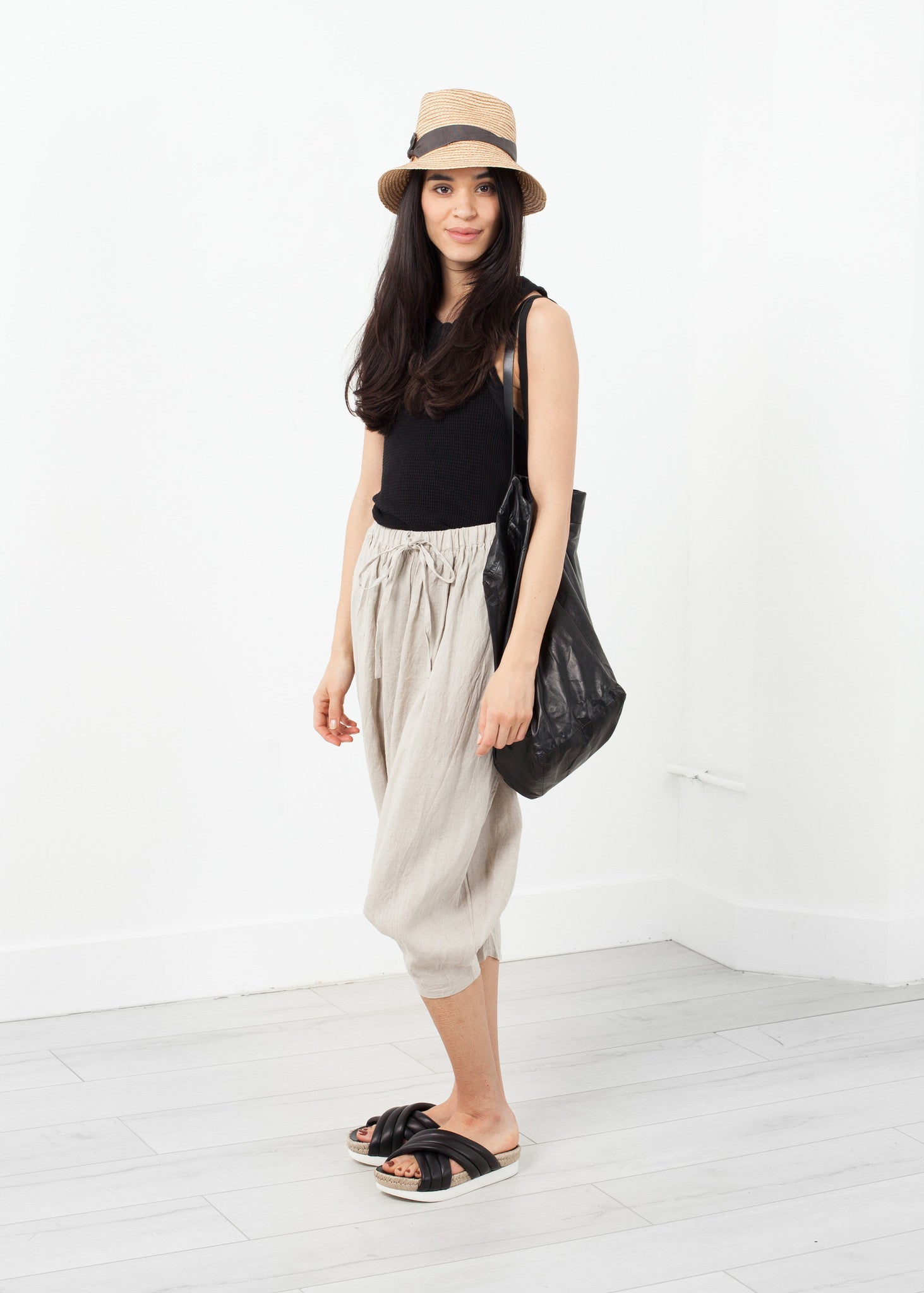 The combination of waffle and rib knits offers uniqueness in look with lots of stretch for perfection in fit. Crew neckline. Extended button placket at front. V:Room. Color Black. 100% Cotton. Made in Japan. Ashley is wearing an S/M.